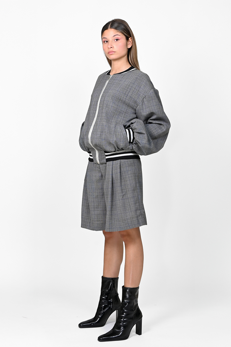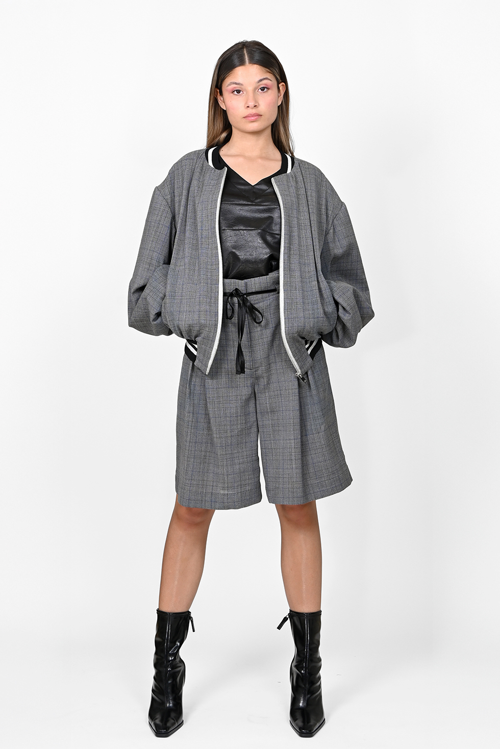 LOOSE-FIT JACKET WITH ZIP FASTENING AND SILVER RIBBON DETAIL, WELT POCKETS, BLACK AND SILVER RIBBED TRIMS AT COLLAR, HEM AND CUFFS, GATHERED SLEEVES AND HEM.